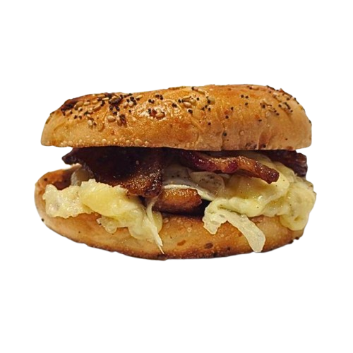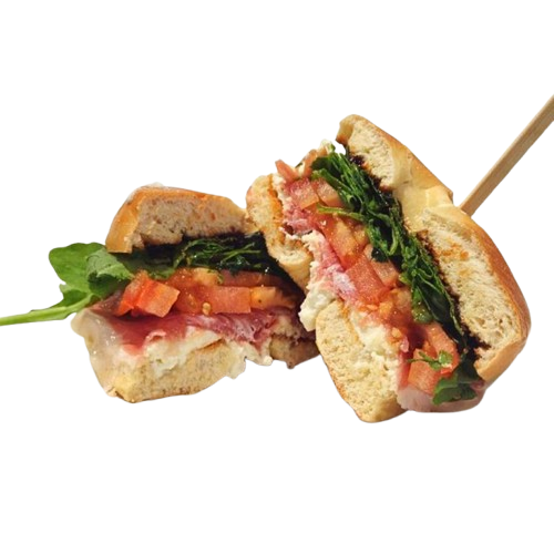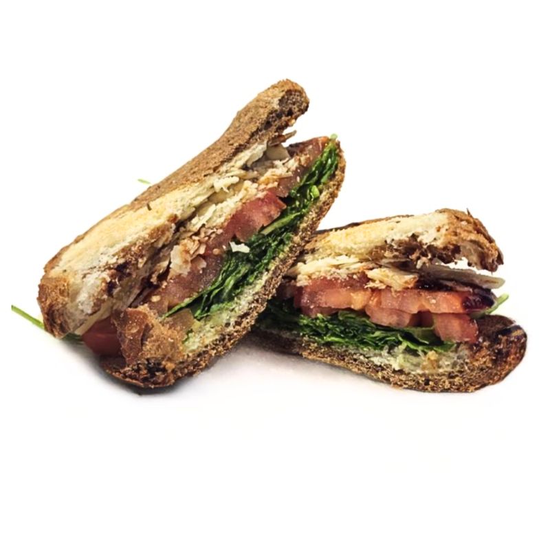 Hickory thick cut bacon baked with raw brown sugar, cheese, thinly sliced balsamic tomatoes, arugula, House sauce between Your choice of bread. Consider adding an organic egg to complement this selection.